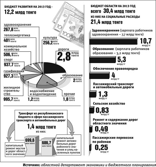 В 2013 году бюджет области по­тратит 30,4 миллиарда тенге.     71% бюджета, это 21,4 млрд тенге, пойдет на социальные расходы.